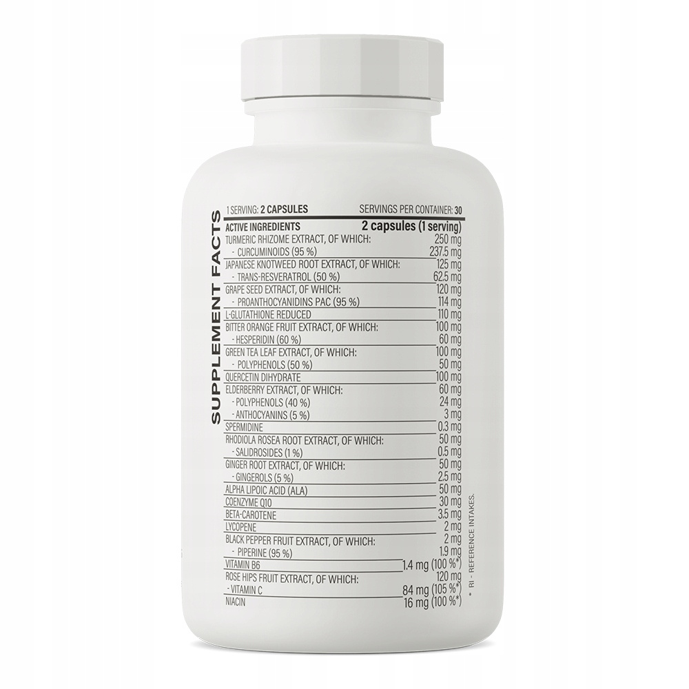 Turmeric rhizome extract - 95% of curcuminoids, bulking agent: hydroxypropyl methyl cellulose; rose hips fruit extract - 70% of vitamin C, japanese knotweed root extract - 50% of trans-resveratrol, grape seed extract - 95% of proanthocyanidins (PAC), L-glutathione reduce, bitter orange fruit extract - 60% of hesperidin, green tea leaf extract - 50% of polyphenols, quercetin dihydrate (from Sophora japonica L. fruits), beta-carotene, elderberry extract - 40% of polyphenols and 5% of anthocyanins, rhodiola rosea root extract - 1% of salidrosides, ginger root extract - 5% of gingerols, alpha lipoic acid (ALA), lycopene, wheat germ extract (Triticum aestevium) rich in spermidine, ubiquinone (coenzyme Q10), inositol hexanicotinate (niacin), anticaking agent: magnesium salts of fatty acids; black pepper fruit extract - 95% of piperine, pyridoxal 5’-phosphate (vitamin B6).