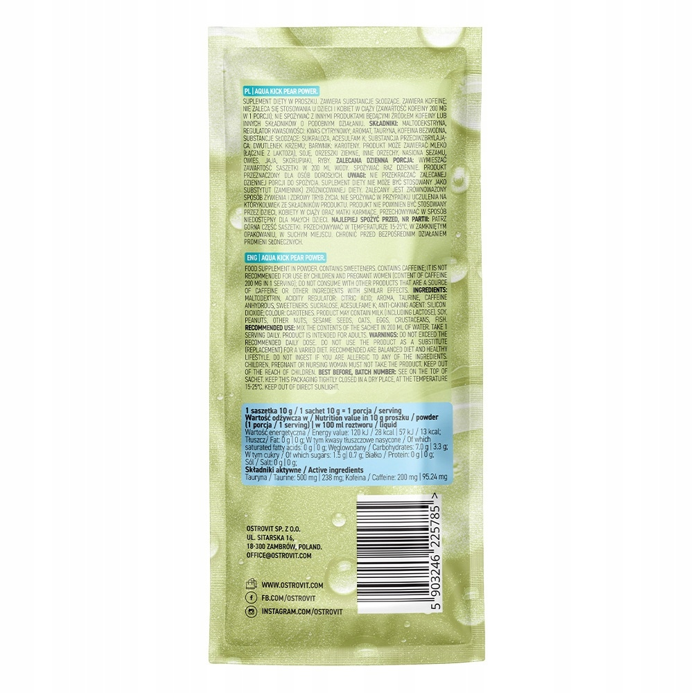 OstroVit Aqua Kick Pear Power is an energizing blend of taurine and caffeine, thanks to which you will increase your strength and motivation, as well as accelerate regeneration after training. The supplement in a short time after consumption will make you feel strong stimulation and willingness to act. Aqua Kick Pear Power will work as a substitute for coffee and energy.