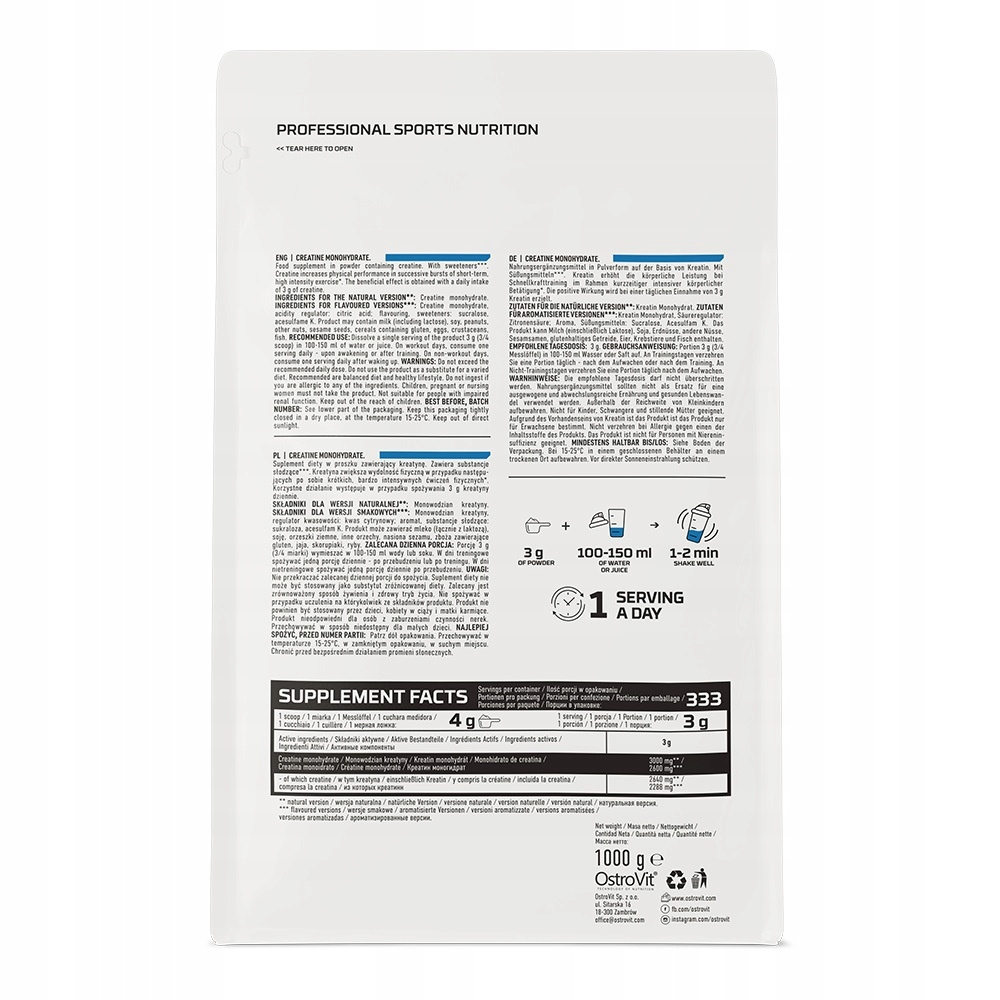 The preparation OstroVit uses creatine monohydrate, i.e. the combination of a creatine molecule with a water molecule into one molecule - because creatine is a hydrophilic compound, it easily combines with water, and thus is a substance that is distinguished by great bioavailability. Creatine monohydrate is the simplest form of creatine in terms of structure,and at the same time the relationship that enjoys the greatest popularity among athletes -perfect for both novice lovers of an active lifestyle,as well as among professionals, which results from the fact that creatine increases physical performance in the case of consecutive short,very intense physical exercise, and the beneficial effect occurs when consuming 3 g of creatine per day.