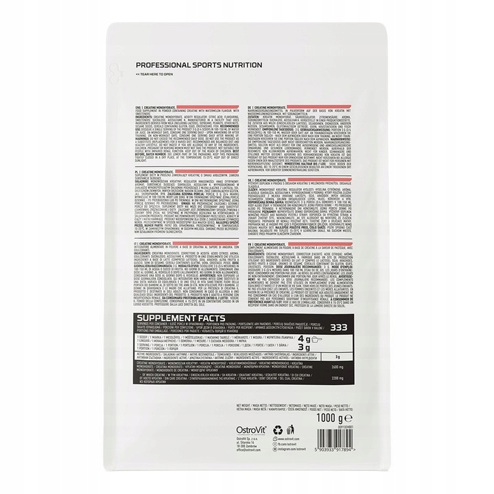 The preparation OstroVit uses creatine monohydrate, i.e. the combination of a creatine molecule with a water molecule into one molecule - because creatine is a hydrophilic compound, it easily combines with water, and thus is a substance that is distinguished by great bioavailability. Creatine monohydrate is the simplest form of creatine in terms of structure,and at the same time the relationship that enjoys the greatest popularity among athletes -perfect for both novice lovers of an active lifestyle,as well as among professionals, which results from the fact that creatine increases physical performance in the case of consecutive short,very intense physical exercise, and the beneficial effect occurs when consuming 3 g of creatine per day.